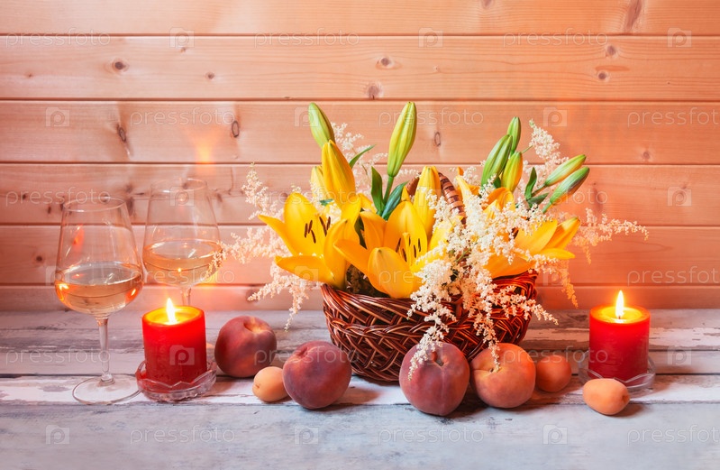 Букет красивых желтых лилий и белых цветков астильбы, бокалы белого вина, горящие свечи и свежие фрукты