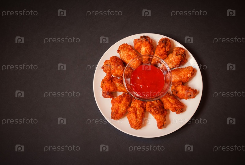 Куриные крылышки в соусе барбекю на белой тарелке на темном фоне
