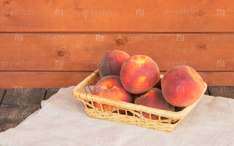 Спелые персики в плетеной корзине на состаренном деревянном столе. Выборочный фокус