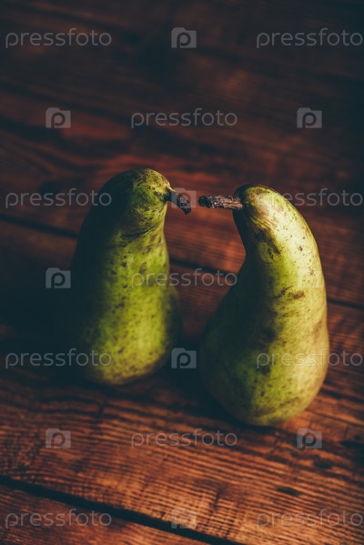 Две зеленые груши на деревянном столе