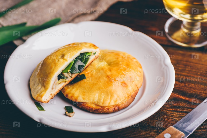 Запеченные в духовке ручные пироги с зеленым луком и грибами на белой тарелке