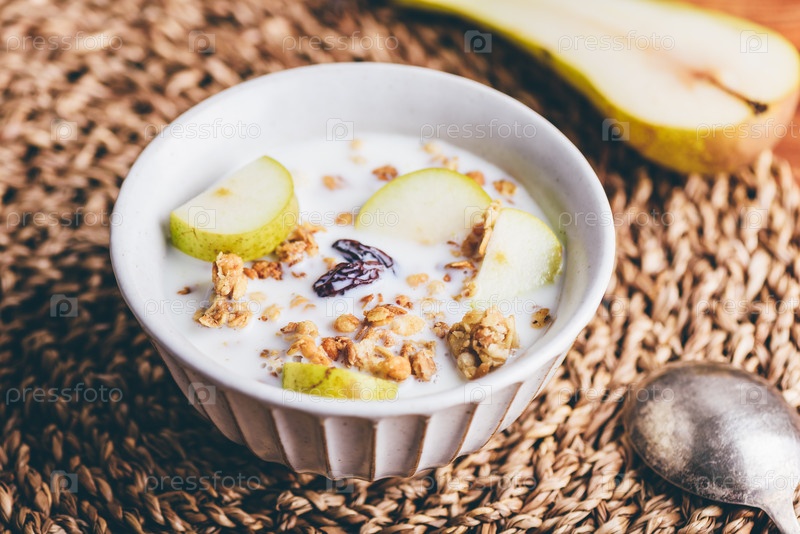 Крупный план чаши с вкусной мюсли и свежей грушей