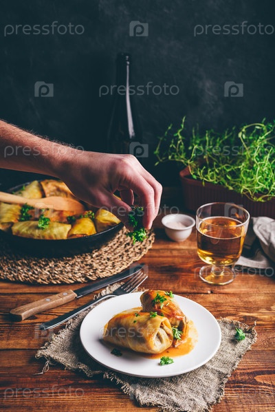 Голубцы с начинкой из говяжьего фарша на белой тарелке. Украсить руки рубленой петрушкой