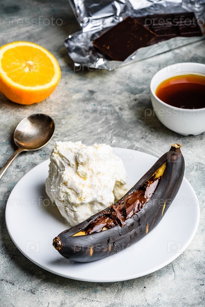 Жареный банан с темным шоколадом и ванильным мороженым
