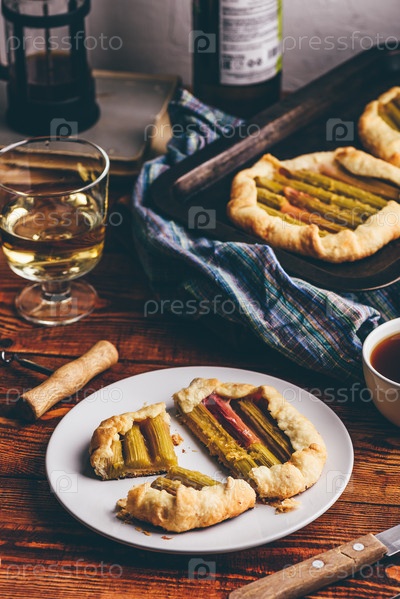 Галетта из ревеня на тарелке с бокалом вина