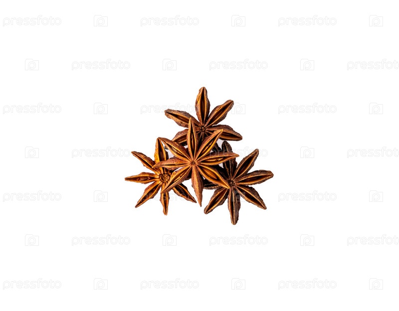 Куча семян китайского звездчатого аниса изолирована на белом фоне под высоким углом обзора