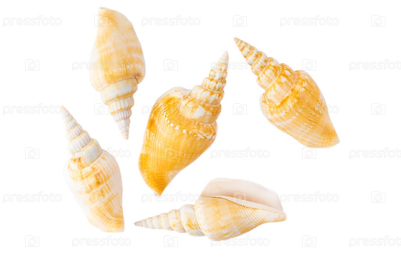 Состав изолированных экзотических морских раковин на белом фоне, вид сверху