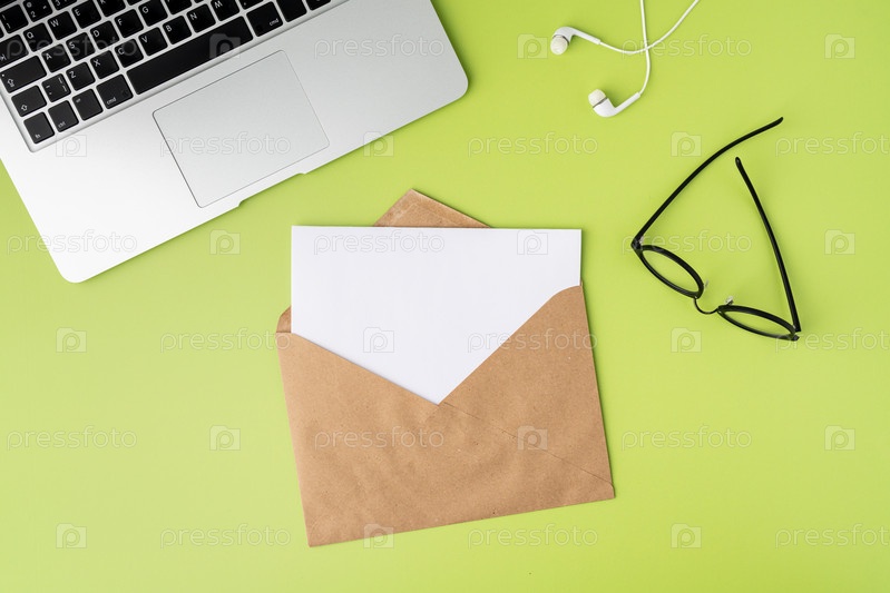 Вид сверху на чистый пустой лист бумаги в открытом ремесленном конверте на светло-зеленом фоне. Клавиатура ноутбука, наушники и очки. Корпоративный рабочий стол, прием корреспонденции