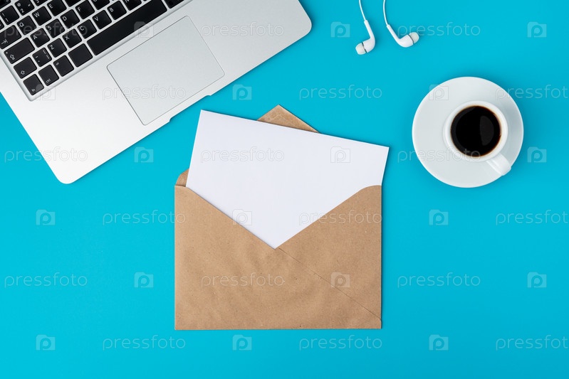 Открытый конверт с чистым листом бумаги на бирюзовом фоне. Клавиатура, чашка кофе и наушники