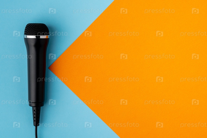 Кабельный микрофон с левой стороны красочного бирюзового и оранжевого фона, вверху, пространство для копирования