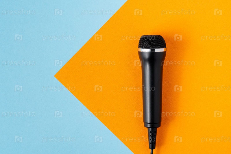 Кабельный черный микрофон на красочном синем и оранжевом фоне, высокий угол обзора, пространство для копирования. Музыкальное профессиональное студийное оборудование. Современная концепция вещания. Макет караоке-развлечений
