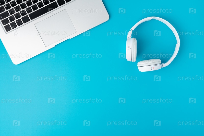 Плоская планировка белых цифровых наушников и ноутбука с обрезанной клавиатурой на синем фоне