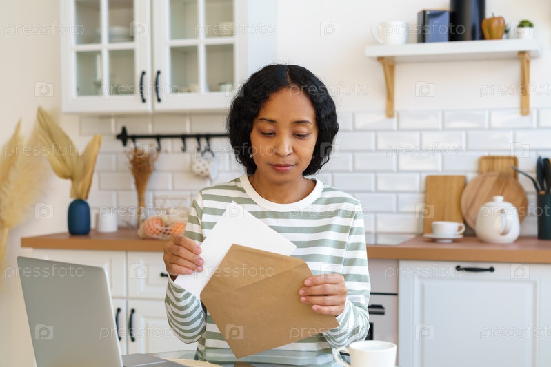 Афроамериканка пишет и подписывает открытку на кухне. Подготовка корреспонденции для почтовой рассылки. Концепция отправки писем. Праздничные приглашения. Поиск идей в Интернете на ноутбуке