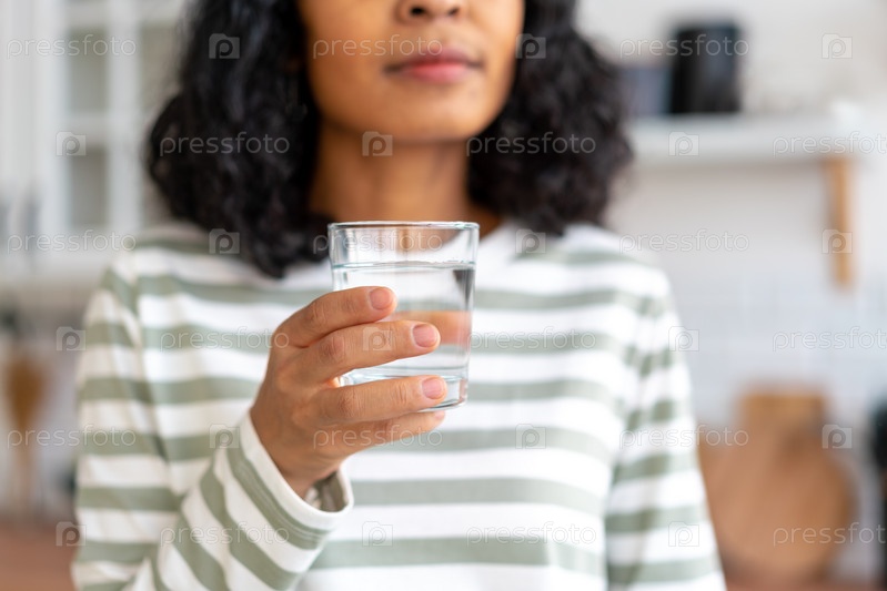 Безликая обрезанная афроамериканка пьет стакан воды на кухне. Освежающее начало дня