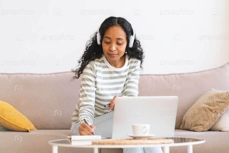 Афроамериканка делает заметки в блокноте, слушая онлайн-курс в наушниках