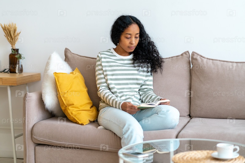 Афро-американская женщина читает книгу, сидя на диване в уютной гостиной. Проводить время в одиночестве