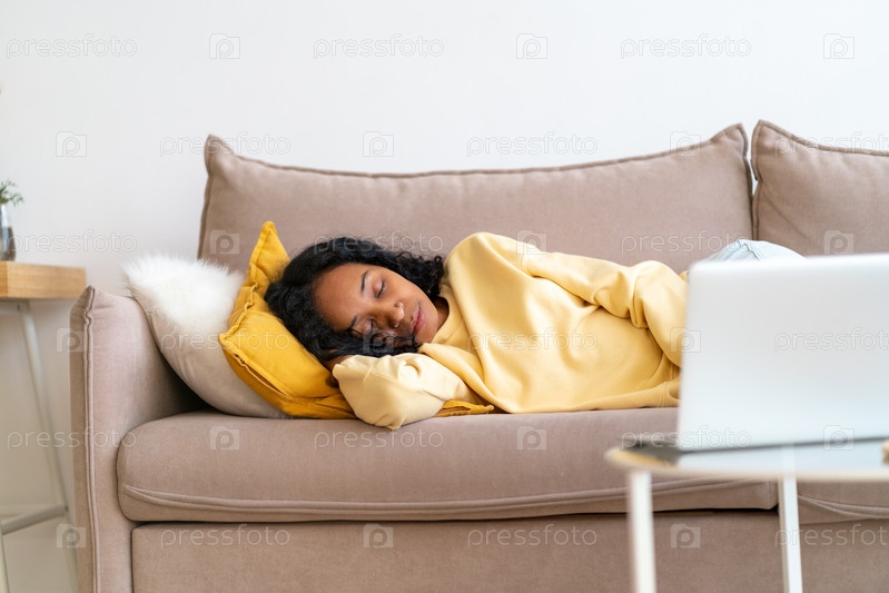 Сонный молодой афроамериканец лежит и спит на диване в гостиной, пока играет фильм на ноутбуке. Скучно проводить свободное время за просмотром фильма. Концепция легкого велнеса и микромоментов