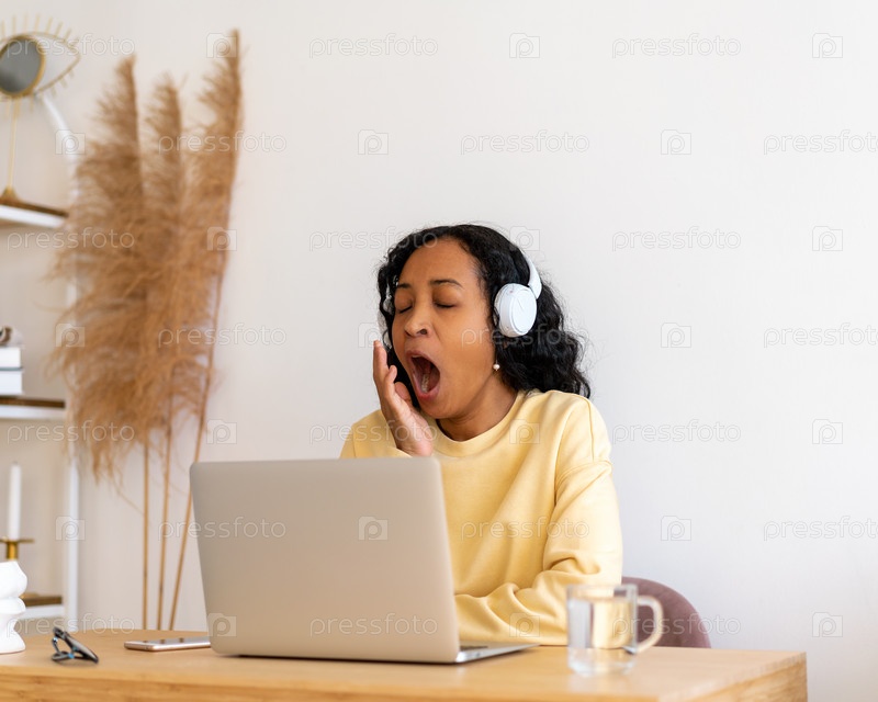 Афро-американский ленивый студент зевает, слушая онлайн-курс в наушниках на ноутбуке. Женщина сидит дома и работает удаленно. Миллениалы работают сверхурочно и устают от рабочей нагрузки