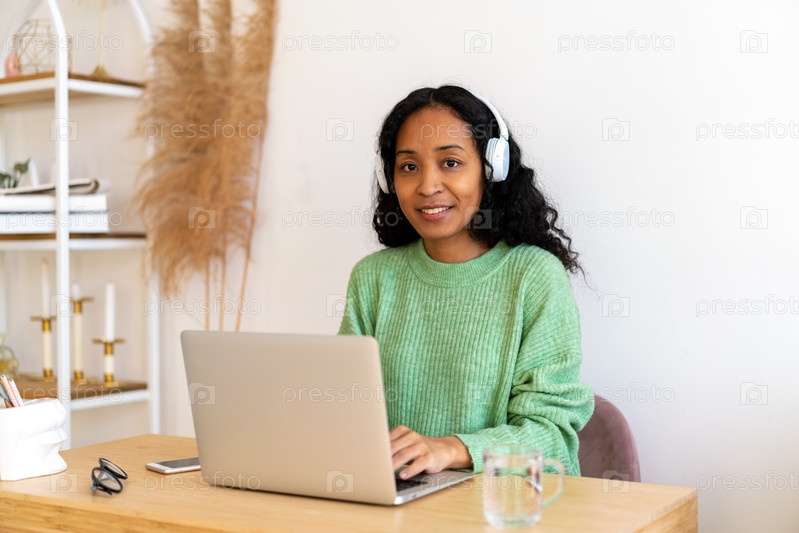 Афроамериканка работает на ноутбуке в наушниках. Прослушивание аудиоподкаста онлайн