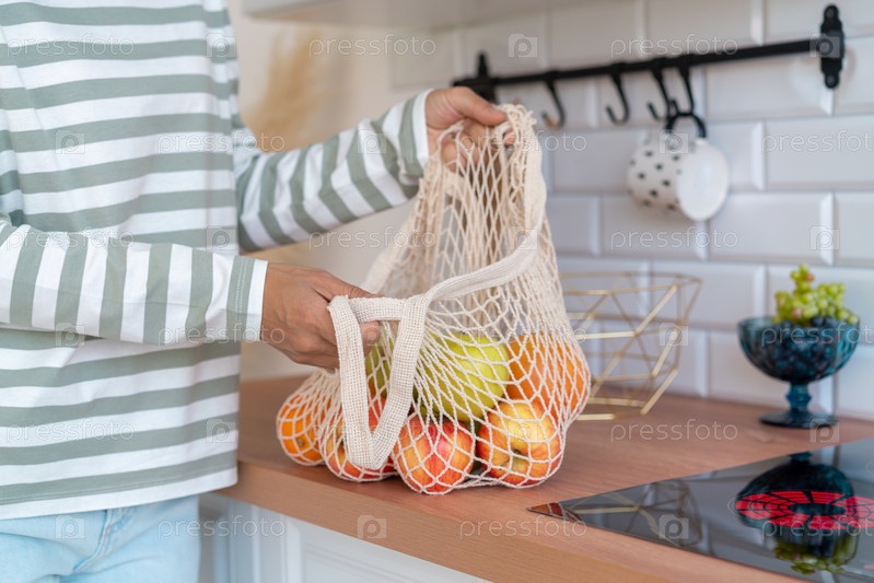 Безликая женщина покупает фрукты в эко-сумке. Сортировка зеленых и красных яблок, апельсинов на кухне. Концепция экологически чистых покупок. Вегетарианские полезные продукты. Устойчивая альтернатива. Пакет без пластика