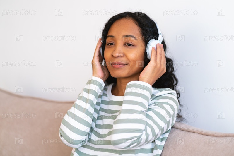 Наслаждаемся музыкой в наушниках. Восхитительная афроамериканка слушает симфонию на диване