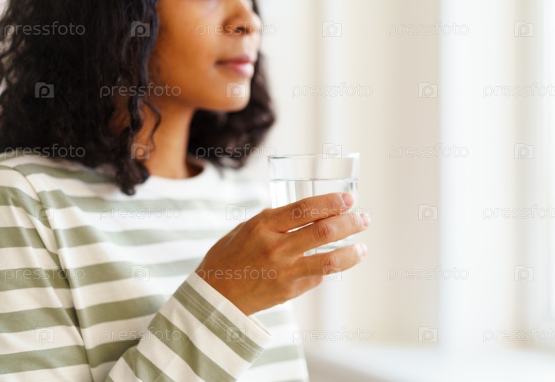 Обрезанный афроамериканский женский стакан воды. Освежающее начало дня