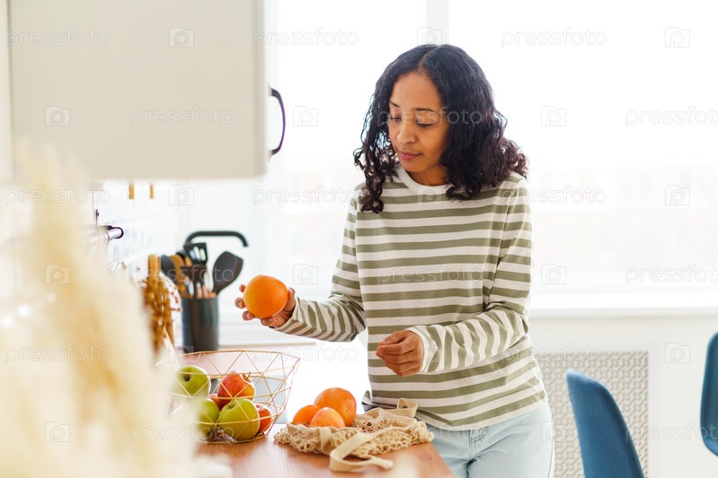 Афроамериканка перебирает фрукты на кухне. Выбор здоровой вегетарианской пищи. Веганский образ жизни. Глядя на спелые апельсины и яблоки. Вынимание из эко-сумки. Естественный дневной свет, горизонтальный