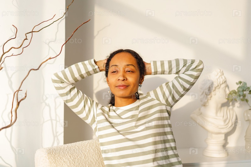 Спокойная и улыбающаяся афроамериканка мечтает, сидя в гостиной перед окном. Естественный свет от заката. Концепция саморефлексии и внимательности. Утреннее время, наслаждаясь жизнью