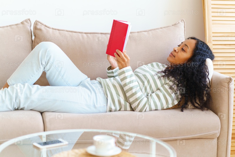 Красивая молодая афроамериканка лежит на диване и читает книгу в твердой красной обложке. Концепция проведения свободного времени с удовольствием. Медленный образ жизни. Отдохнуть от цифровых гаджетов
