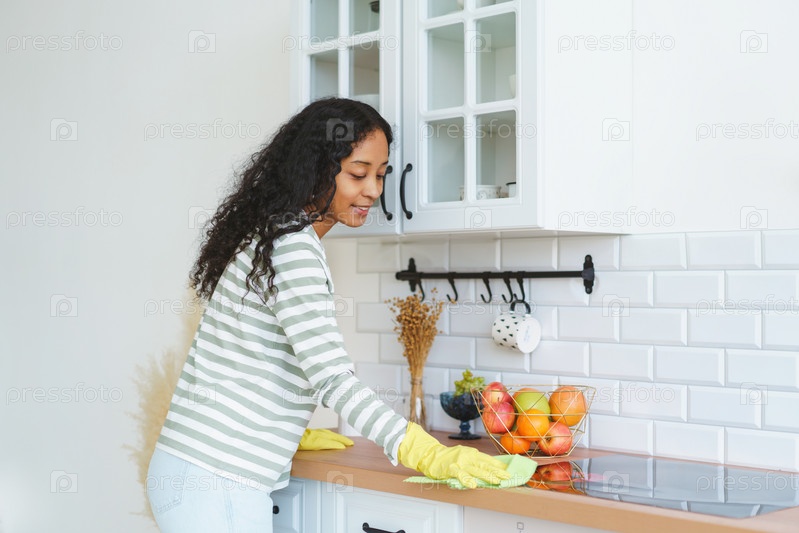 Афроамериканка в резиновых перчатках занята домашними делами на кухне