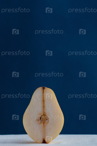 Половина груши на белом подиуме на синем фоне, минимальный натюрморт