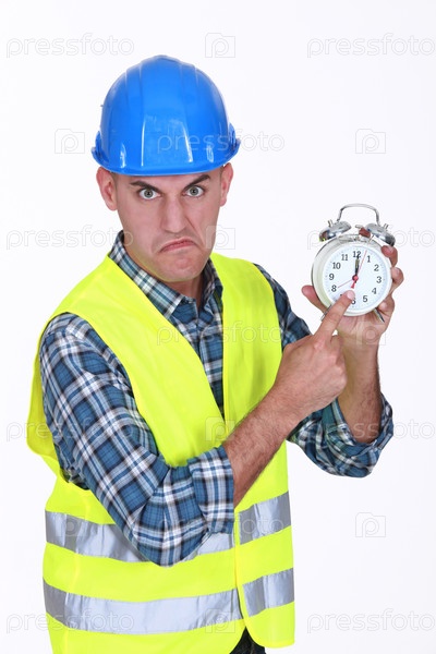 Сердитый строитель указывает на будильник