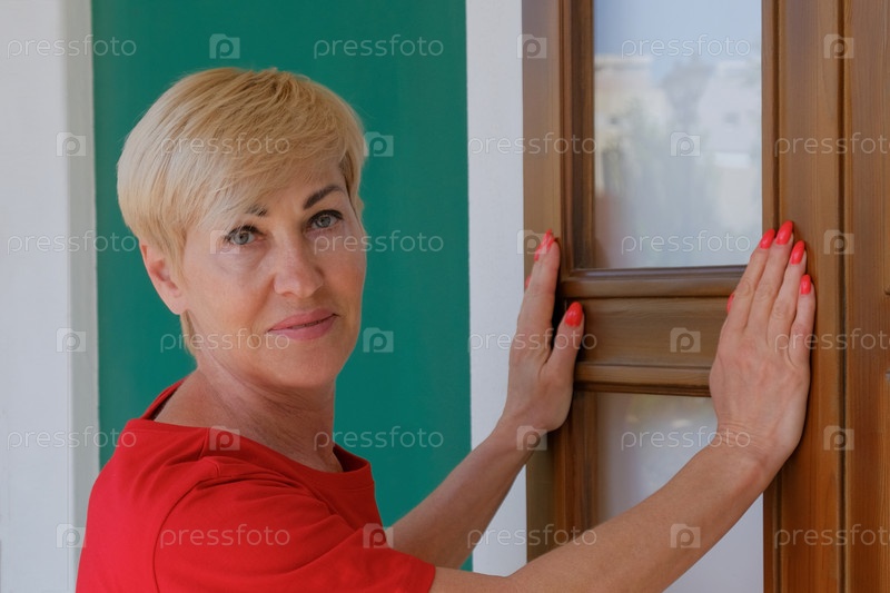 Женщина в возрасте с короткой стрижкой в красном на бело - зеленом фоне придерживает руками рамку окна