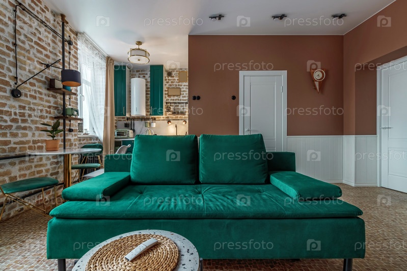Стильная гостиная в доме с современным ретро-дизайном интерьера, бархатным диваном, растениями, плакатом, макетом карты, книгой, лампой и персональными аксессуарами в домашнем декоре