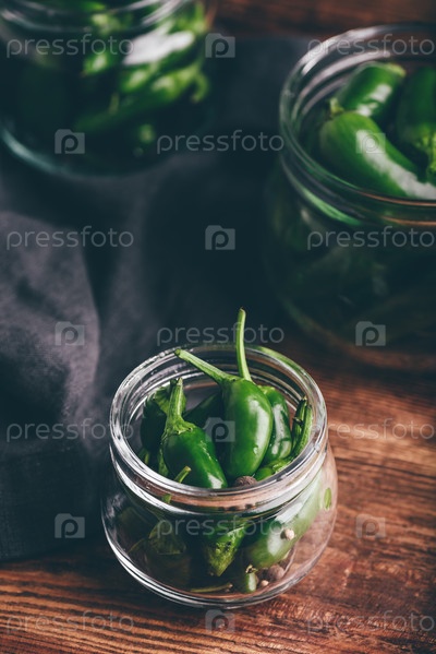 Перец халапеньо в стеклянных банках для консервирования с укропом и чесноком на деревянном столе