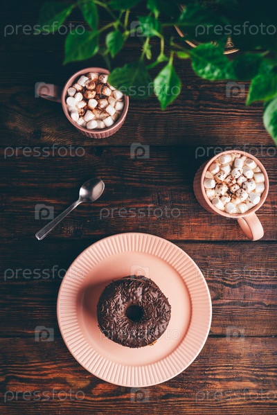 Стопка шоколадных пончиков и горячего шоколада с зефиром