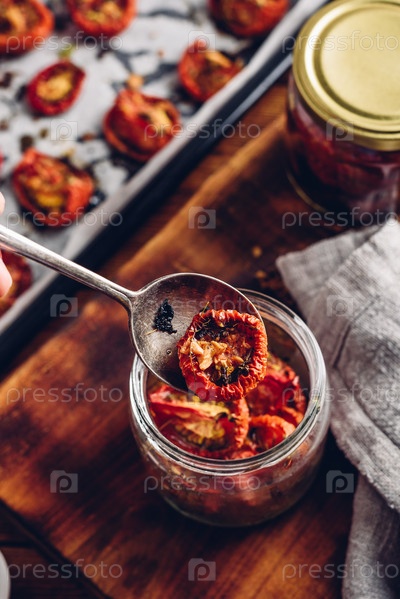 Хранение вяленых помидоров с тимьяном и чесноком в стеклянной банке