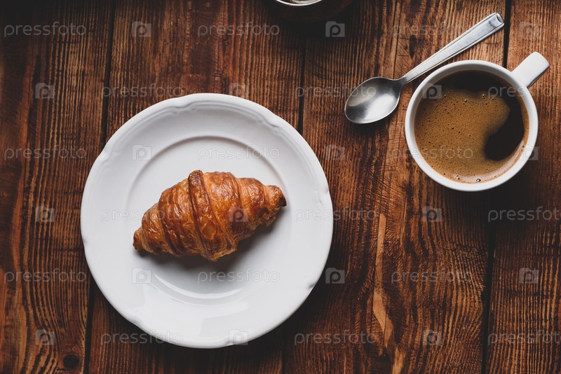 Свежий круассан и чашка кофе на деревянной поверхности. Вид сверху