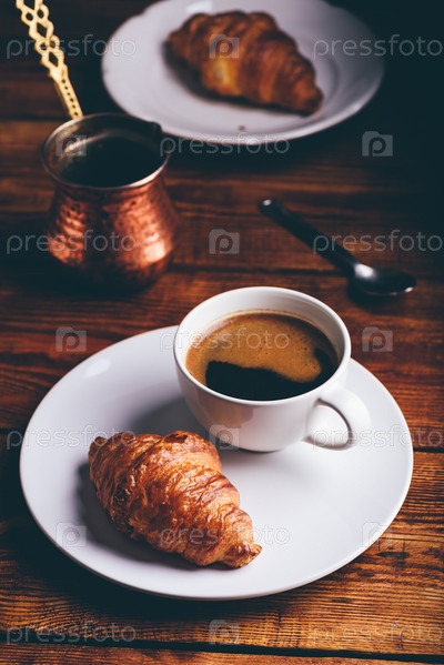 Чашка турецкого кофе и круассан на белой тарелке на завтрак