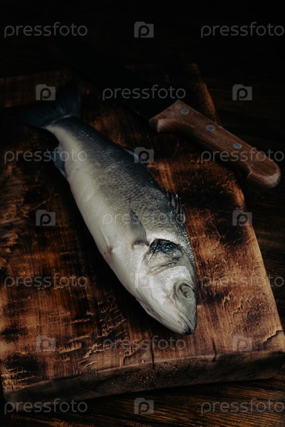 Свежий морской окунь и нож на разделочной доске