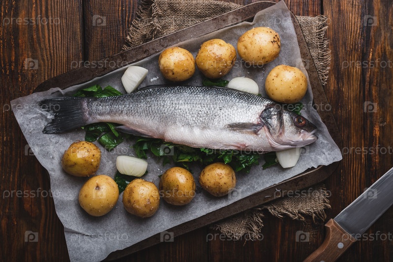 Свежий морской окунь, фаршированный щавелем, готов к запеканию с картофелем и луком