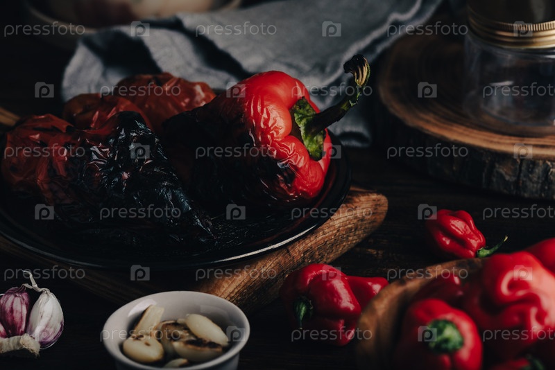Обугленный болгарский перец, перец хабанеро и зубчики чеснока для приготовления острого кетчупа чили