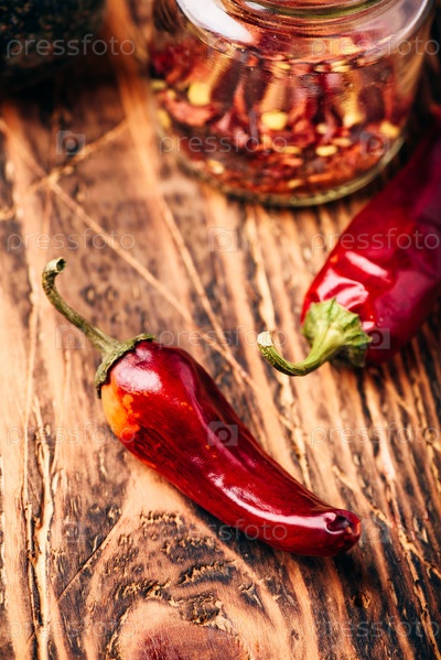 Сушеный красный перец чили на деревянной поверхности