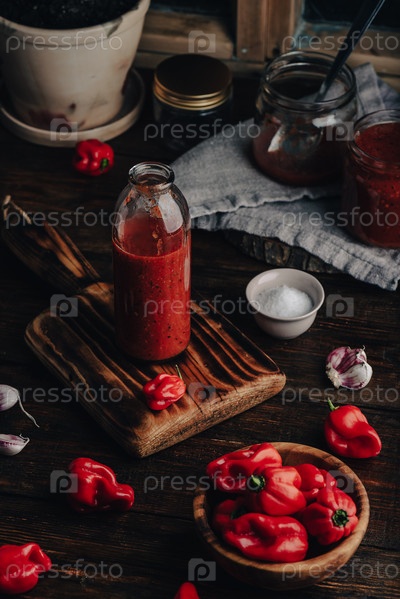 Свежий приготовленный острый соус чили с перцем хабанеро в бутылке