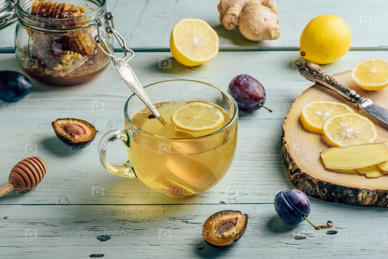 Чашка чая с лимоном, медом и имбирем
