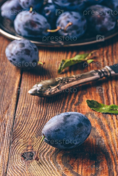 Спелые сливы с листьями и ножом