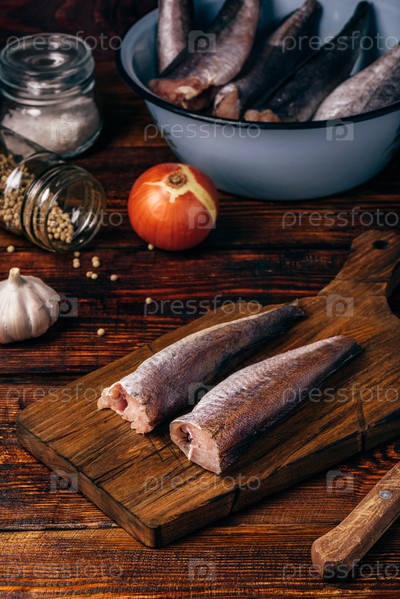 Тушки хека на разделочной доске