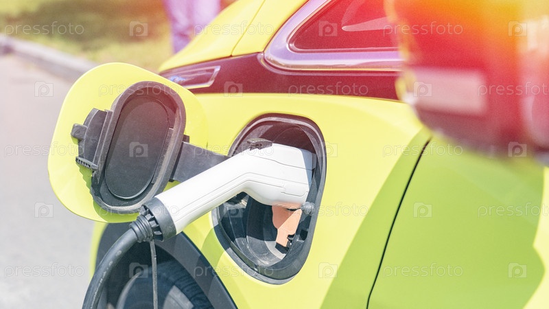 Современный желтый электромобиль заряжается в солнечный день после долгой поездки