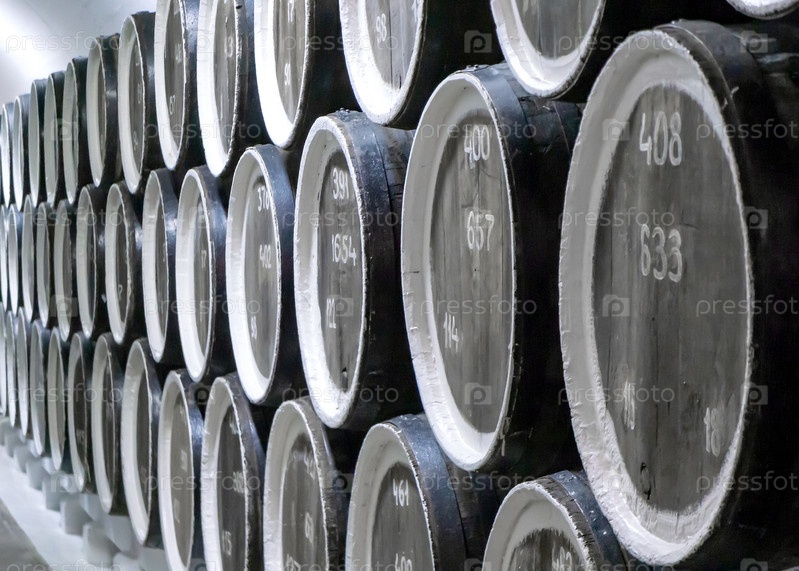Большие деревянные бочки лежат в подвале