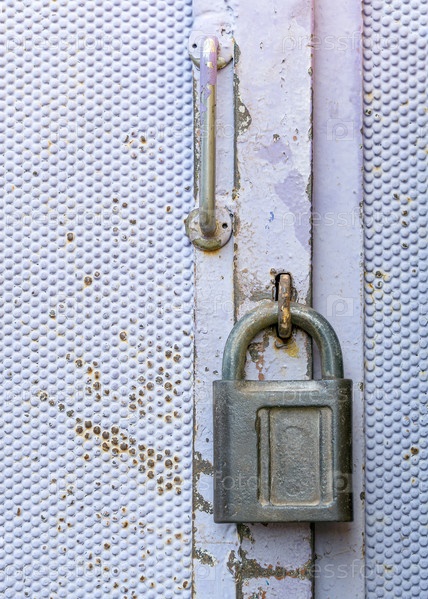 Замок висит на металлической двери. Скоба замка помещается в петли двери
